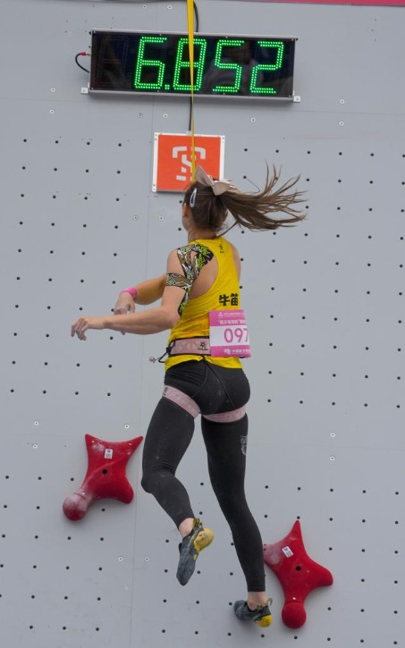 十六进八,牛笛对阵自己的国家队前队友汪生艳,两人几乎同时到顶,牛笛一侧的计时器显示:6秒62!获胜的同时,这一成绩将她个人最好成绩提升了近0.1秒。