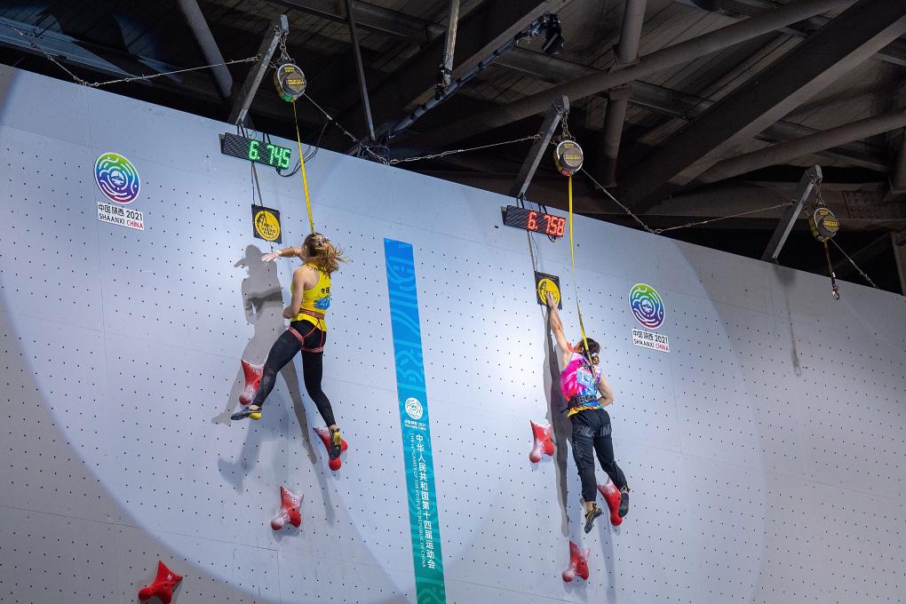 2024年5月18日,中国选手牛笛(右)与队友周娅菲在巴黎奥运会资格系列赛上海站女子攀岩速度赛半决赛中。新华社记者 许雅楠 摄