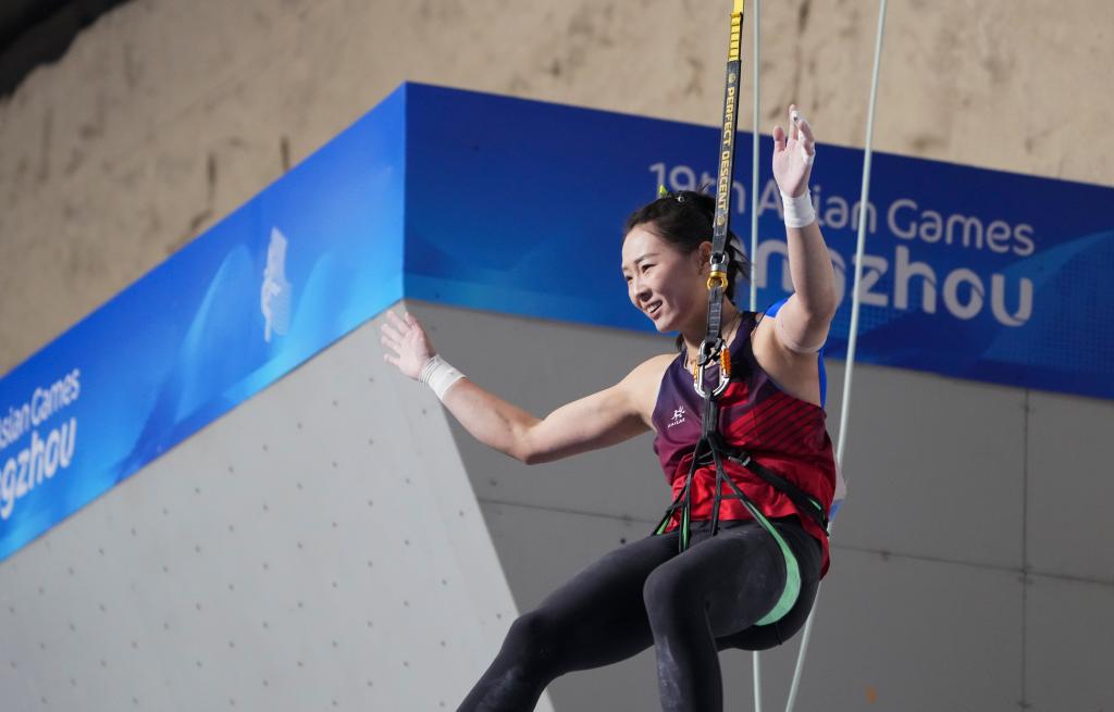 而牛笛唯一一次登上速度攀岩国际大赛最高领奖台,也是和邓丽娟一起。2023年杭州亚运会,她作为最后一棒顶住了印尼队的追赶,为中国队夺得了亚运会史上首枚女子速度接力金牌。