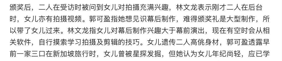 TVB在澳门举办《万千星辉颁奖典礼》,现场星光熠熠,除了现役TVB艺人悉数登场之外,TVB还邀请了很多已经离巢的小生、花旦,以颁奖人的身份现身,给大家制造惊喜,其中就有郭可盈、林文龙夫妇。两人以夫妻档的形式上台颁发“最佳女主角”,相信给场内外的观众都带来巨大的惊喜。而实际上夫妻俩当天还带上了15岁的女儿林天若一起出席颁奖礼,不过林天若没有在典礼后与父母一同接受访问,全程她都在后台,很低调。