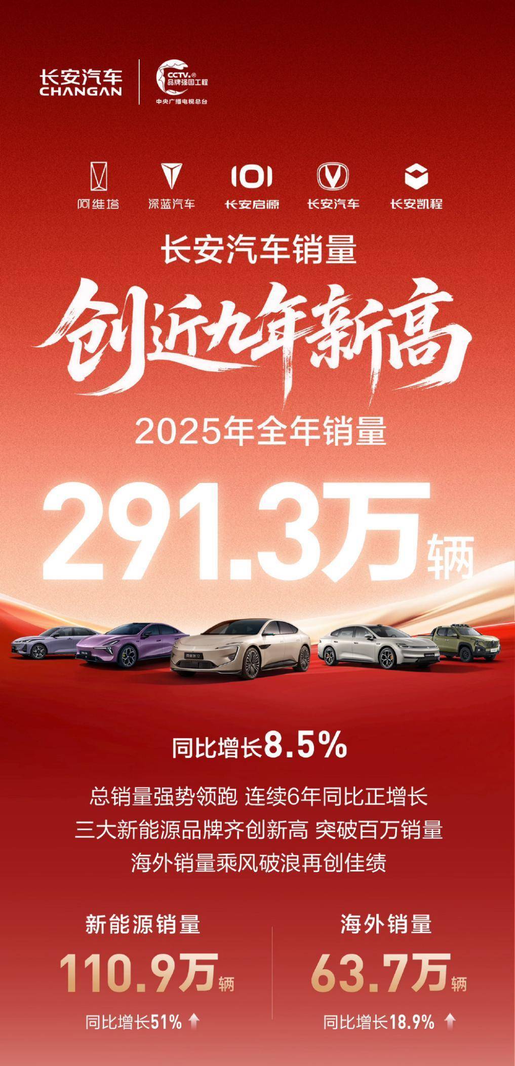 长安汽车长安汽车2025年自主品牌销量达246.8万辆,同比增长10.86%,集团全年总销量291.3万辆创下近9年新高,连续6年实现同比正增长,妥妥的自主阵营“潜力股”。其中,新能源销量突破110.9万辆,同比激增51%,成功跻身“新能源百万销量俱乐部”,成为销量增长的核心驱动力;海外销量达63.73万辆,全球化布局持续提速。