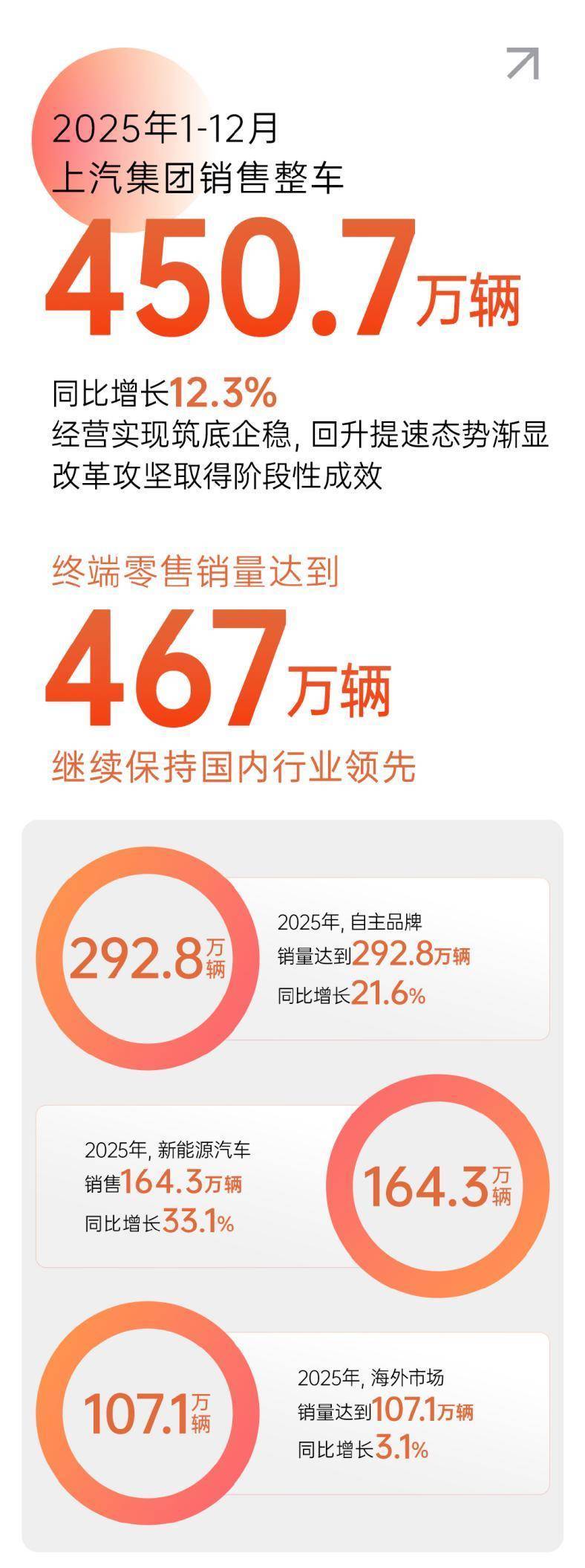 上汽集团上汽集团2025年自主品牌销量达292.8万辆,同比激增21.6%,集团全年总销量450.7万辆,自主份额攀升至65%,相当于每卖出3辆车就有2辆来自自主阵营,彻底摆脱了对合资品牌的依赖,实现“止跌回升”的华丽转身。