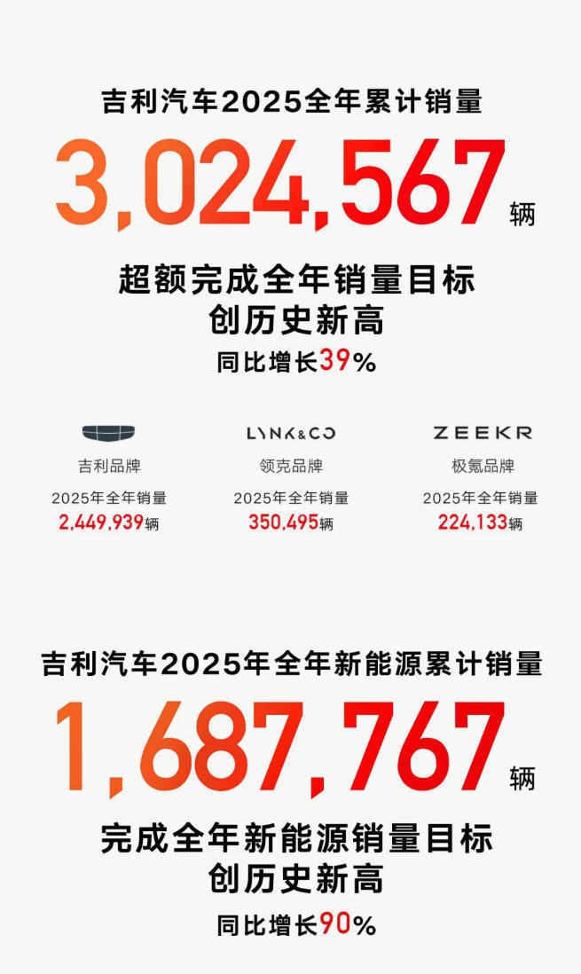 吉利汽车吉利汽车2025年以3024567万辆、39%的同比增速超额完成目标,堪称“增速黑马”直接跻身自主第二梯队头部。