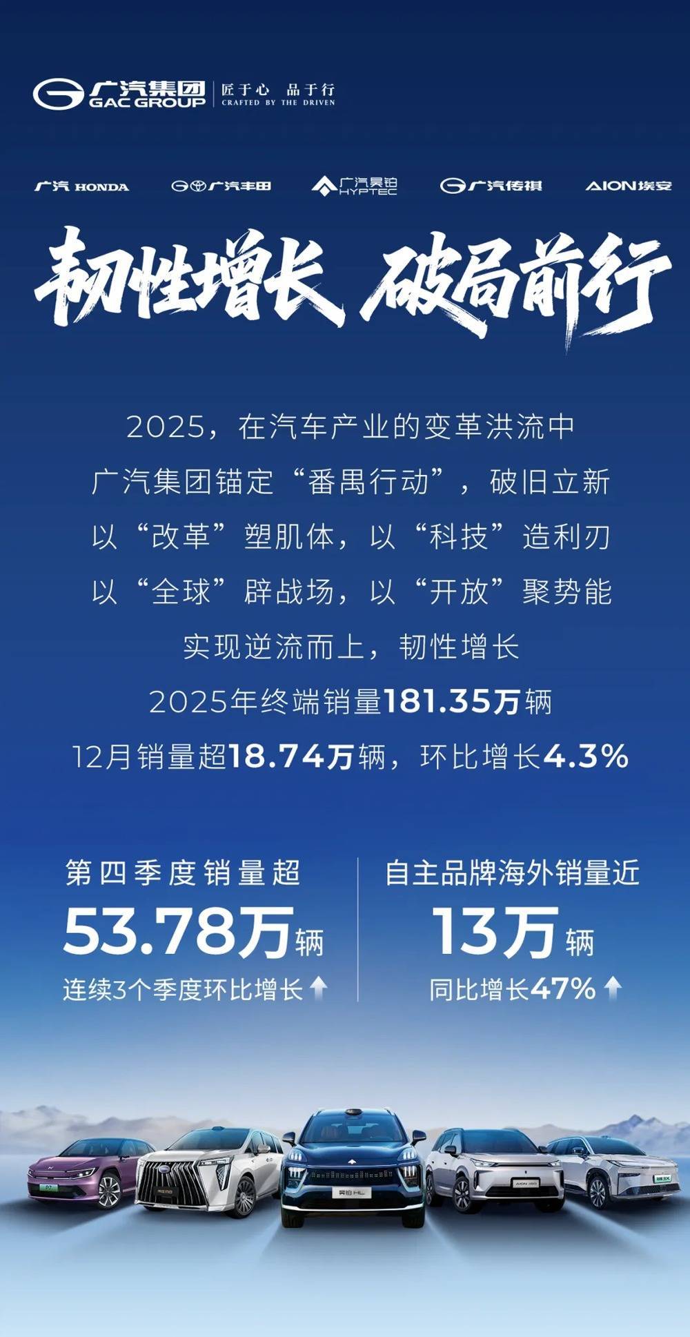 广汽集团广汽集团2025全年汽车销量172.15万辆,全年终端销量181.35万辆(含合资品牌)。数据显示,第四季度全集团销量超53.78万辆,较第三季度增长25.56%,连续三个季度销量实现环比正增长,且增速不断扩大。同时,广汽海外拓展提速,自主品牌全年海外销量近13万辆,同比增长47%。