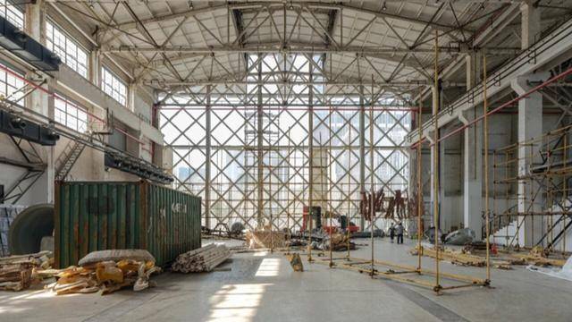 环顾四周,传统绘画类作品也不像以往那样安分地呆在白色展墙上,而是被错落地悬挂在临时搭建的脚手架上。新媒体作品的展示则不同于大家熟悉的那种“小黑屋”面貌示人,而是以立体化的装置形式出现。再往里走,便看到了本次“现场”单元最为大型的个人项目:胡项城的《陌生者的行程II》。此项目占据了近千平方米的空间,差不多是一楼展厅面积的三分之一。里面包罗万象,既有绘画、雕塑、影像与装置作品,也有起重机、卡车、集装箱、器械、水泥管道、链条、石柱等林林总总各种实物,与展厅的建筑(这个曾经作为上海飞机制造厂冲压车间)共同构建了时空交错的叙事空间,以及多感官的、情境化的感知现场,并营造出具有粗粝质感的后工业时代特性的恢宏场域。