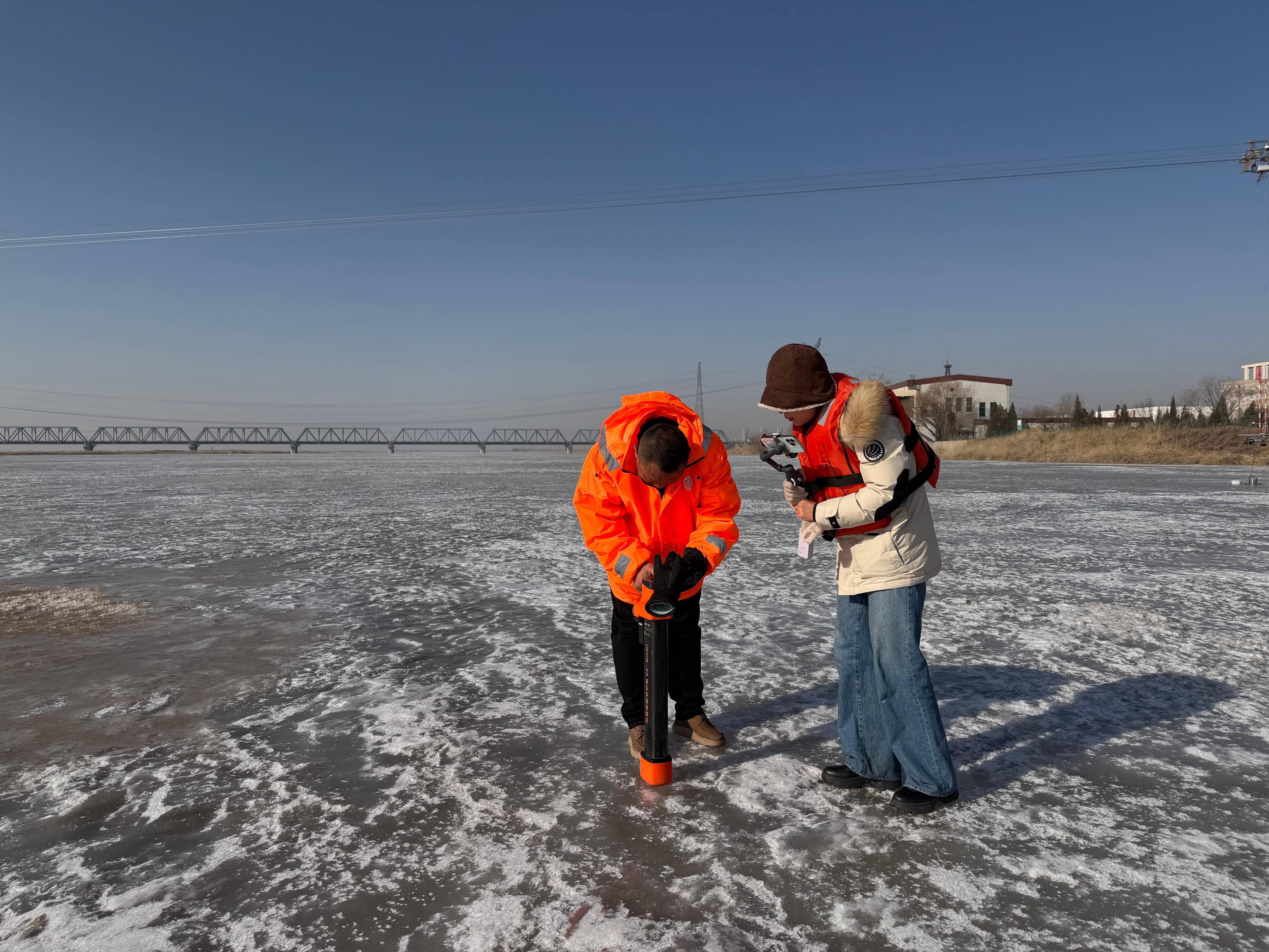 包头水文站职工正在进行冰厚测量。人民网记者 欧阳易佳摄